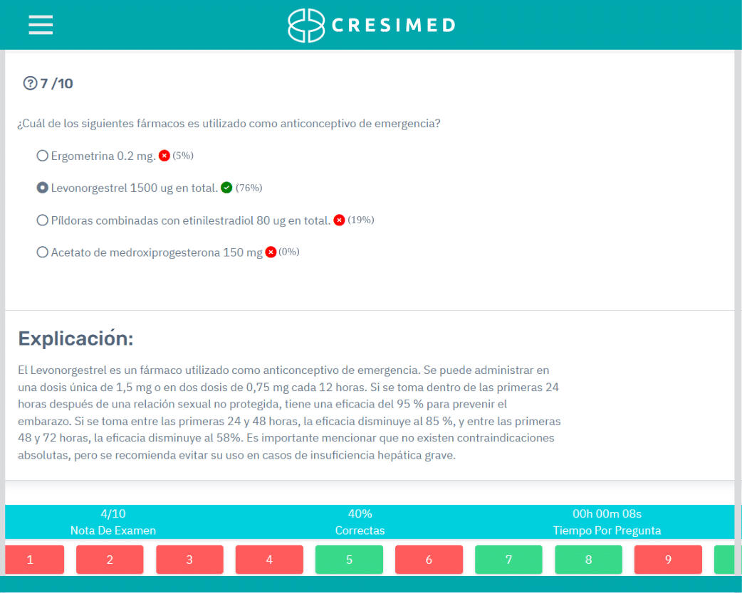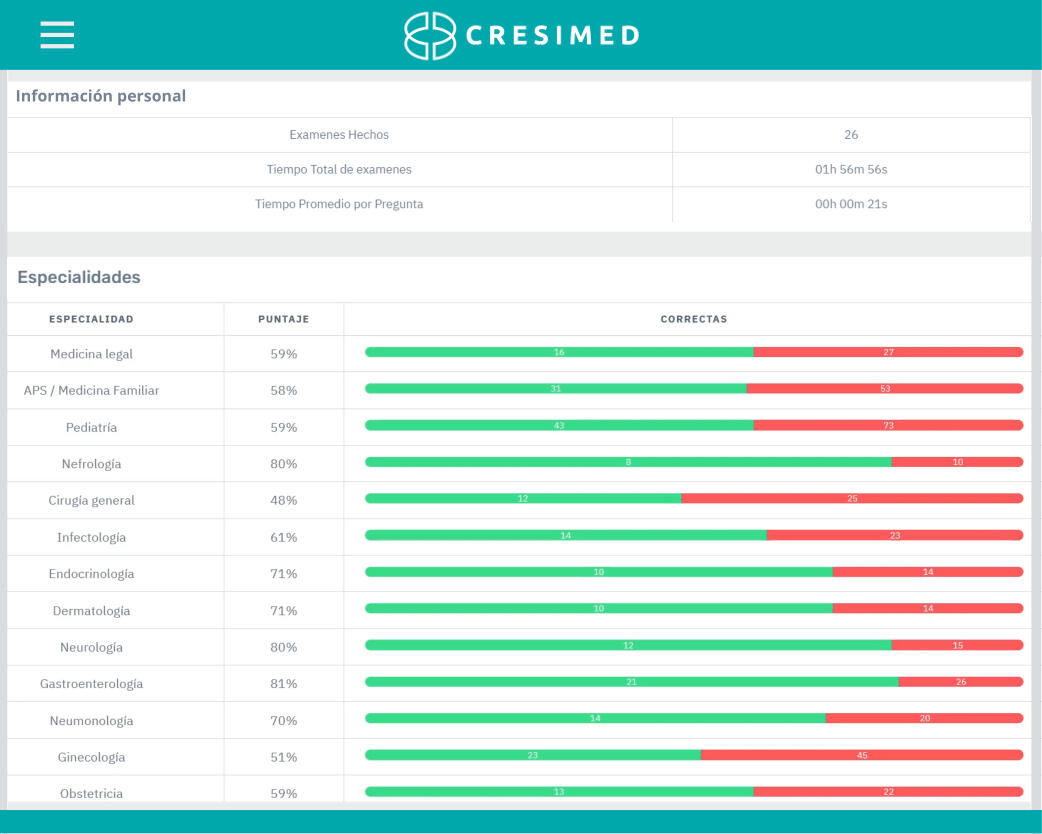 Cresimed te muestra tu rendimiento real: porcentaje de aciertos, errores frecuentes y especialidades que necesitás reforzar. ¡Nada mejor que ver cómo progresás para motivarte y seguir avanzando!Estudiás con datos, no con sensaciones.